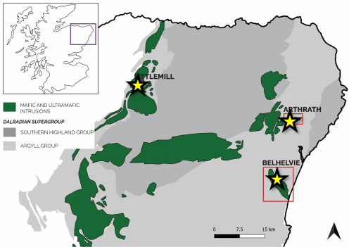 The Younger Gabbros are interpreted to have formed at the margin of the Laurentia continent when subducting oceanic crust triggered partial melting of the mantle, and the resulting magmas were emplaced into the Dalradian metasedimentary country rocks via crustal scale structures. Multiple large intrusions occur within an area of approximately 100 by 100 kilometres.